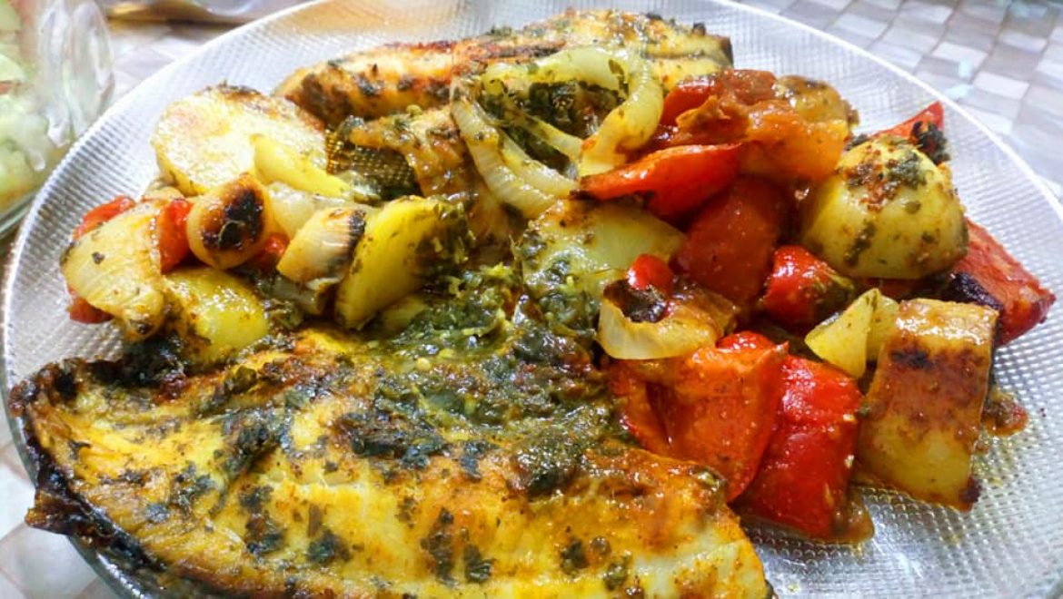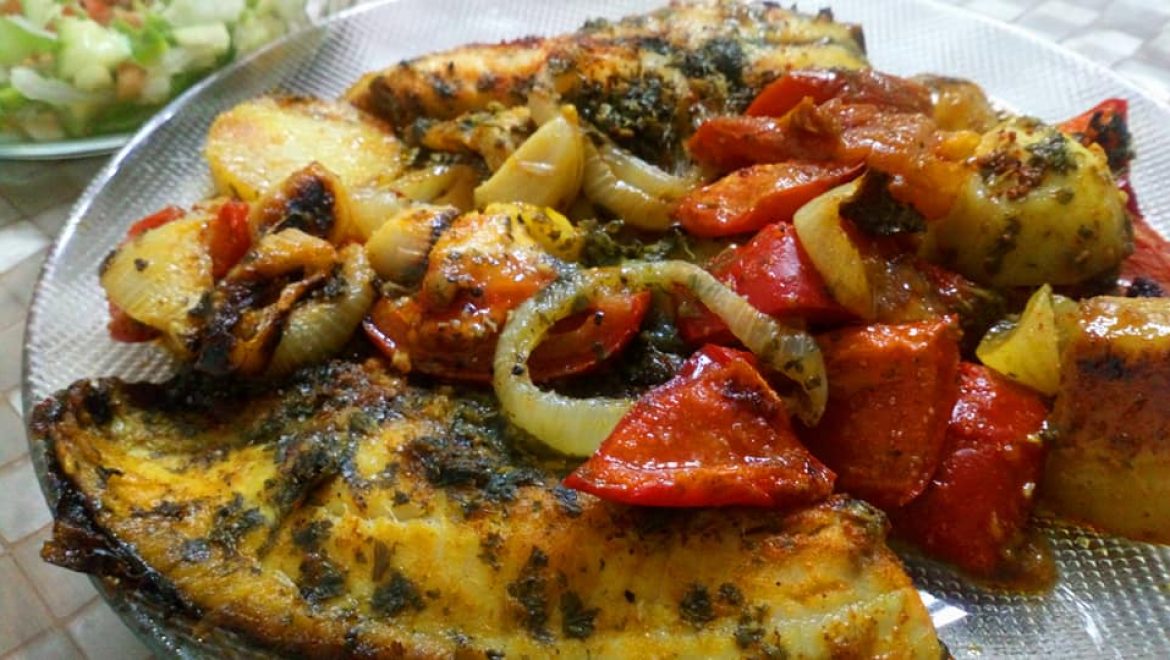 נתחי דגים מתובלים, וירקות אפויים ברוטב עסיסי טעים וחריף .