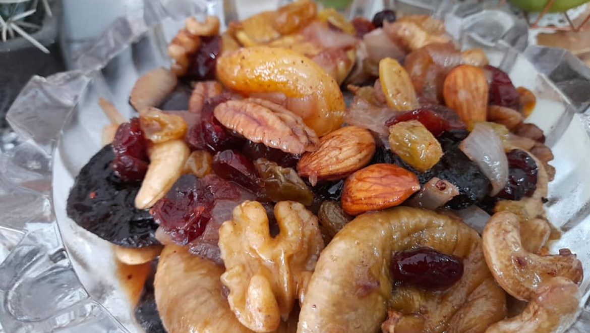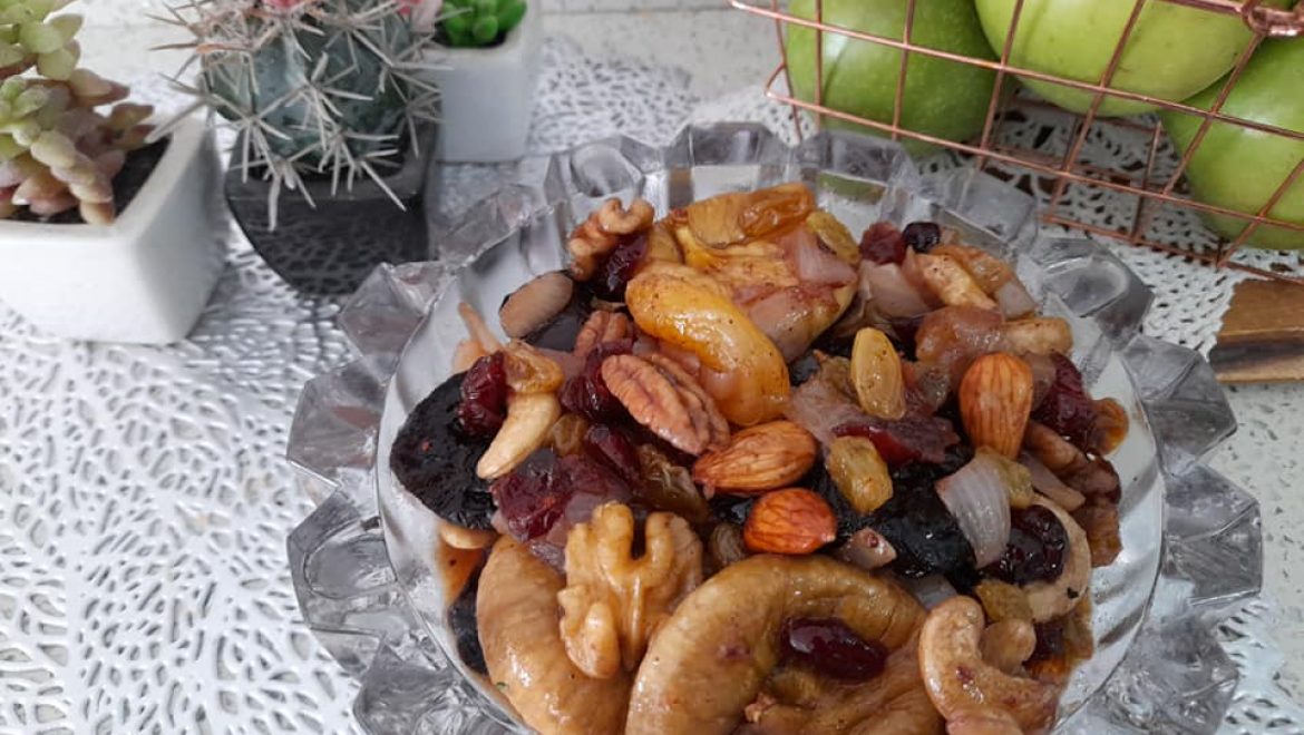 לאחר שהבצל מזהיב מוסיפים את הפירות יבשים והפיצוחים, יין , סילאן והתבלינים ומערבבים.