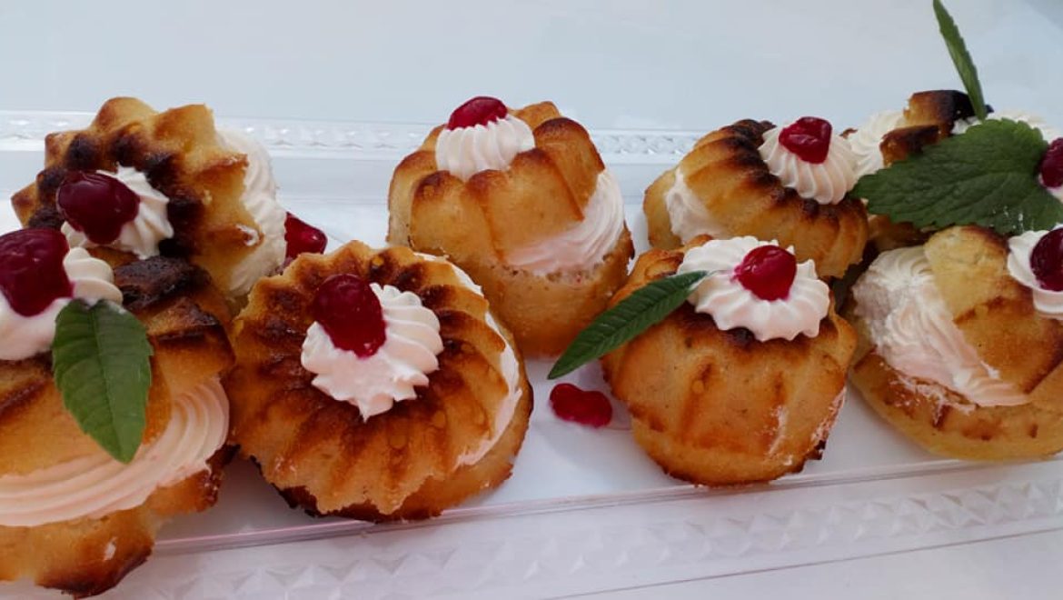 מתכון מושלם של סברינה פרווה. עוגה אישית ספוגה בסירופ סוכר ממולאת בקרם וניל ודובדבן מסוכר בניחוח עלי לואיזה לימונית כקינוח גם לאחר ארוחה.