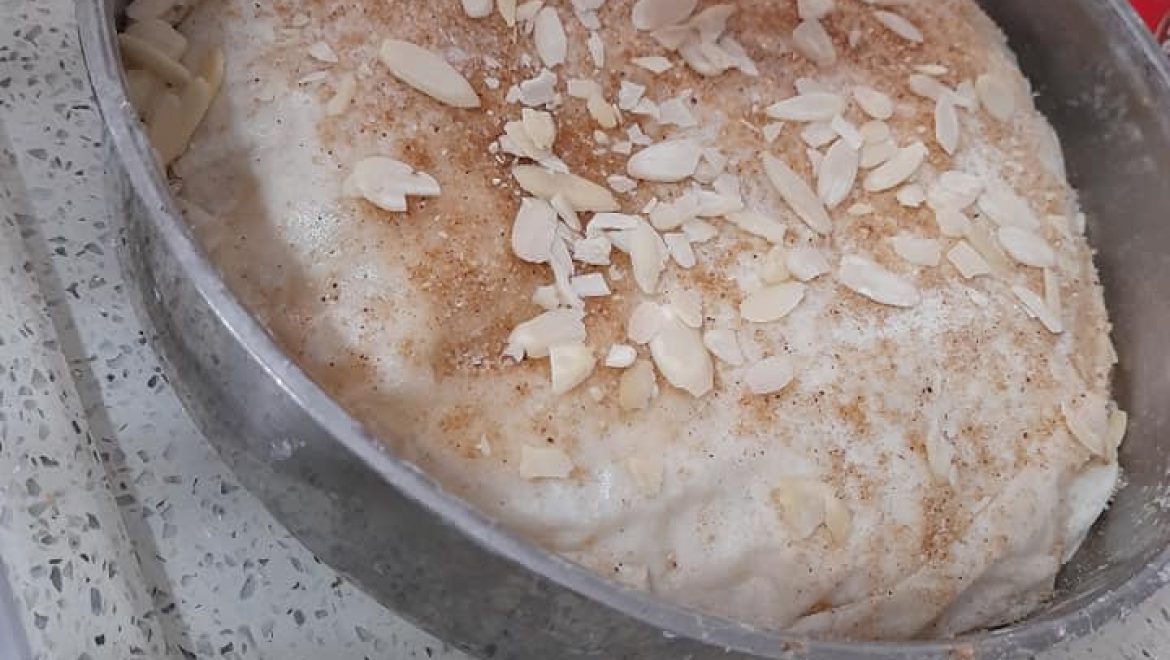 מרססים מעל שמן ומפזרים מתערובת הסוכר ושקדים פרוסים.
