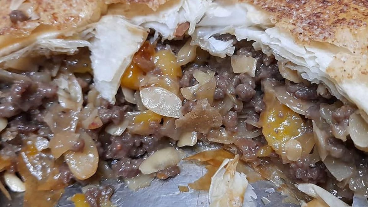 פסטייה ממולאת בבשר בטעם קינמון עם מיני פירות יבשים.